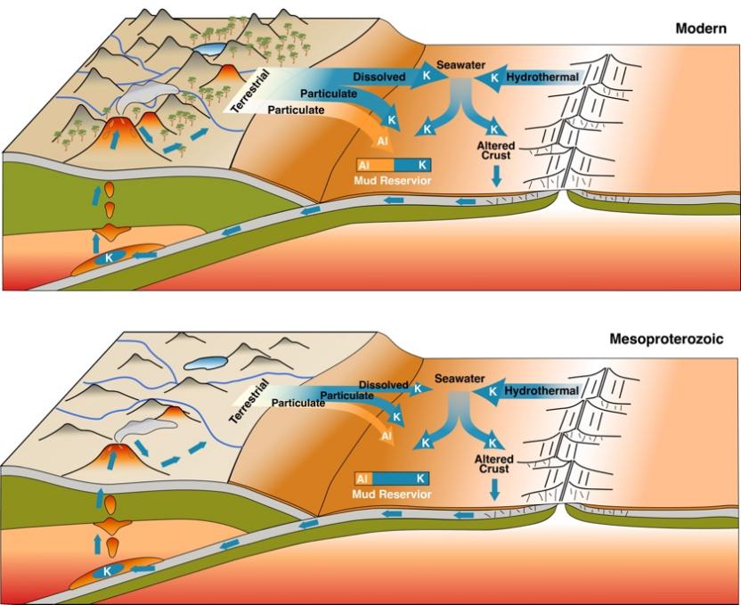 大气氧化是地球宜居性演化的重大事件,深刻影响地球多圈层相互作用。近年来,永利304官网唯一表生地球化学教育部重点实验室李高军教授团队重点关注大气氧化与大陆风化之间的相互作用。例如,新元古代大气氧化事件可能通过氧化作用,加深风化前锋带,增强风化作用CO2吸收效率,从而引起全球性雪球地球事件(Wei & Li, 2024)。根据风化带氧化推进假说,大陆风化与大气氧化理应存在耦合关系,但缺乏深时大陆风化记录予以支撑。最近,该团队根据元素地球化学循环原理,提出基于页岩K/Al大数据恢复大陆风化的新方法。大陆风化向海洋同时提供K和Al而洋壳风化仅仅提供K(图 1),大陆风化贡献占比越高,海洋页岩沉积K/Al越低。根据近1.8万个页岩数据集成,研究发现在晚新元古代-早古生代之后,大陆风化呈现数量级增长,与大气氧化过程密切相关。研究还认为,大陆风化P输入导致的有机碳埋藏与大气氧化之间存在正反馈作用,进一步促进大陆风化与大气氧化(图2);晚新元古代-早古生代大陆风化增强之后才能形成大量黏土,并深刻影响俯冲过程、造山运动、岩浆作用、金属矿产和油气资源的形成;大陆风化增强有利于岩石K、P等营养元素释放,产生的黏土也有利于陆地水分保持,这些因素可能是植物登陆的前提。