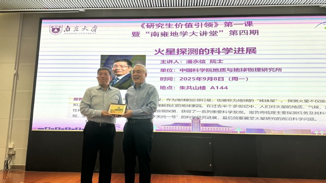 第四期 “南雍地学大讲堂” 报告,以火星探测进展为核心,从人类探测脉络、核心科学问题,到“祝融号”成果与前沿方向,为师生带来了一场精彩的学术盛宴,互动环节亦迸发思想火花。潘永信院士解答疑问时,特别寄语25级新生,希望此次分享成为他们探索行星科学的起点,鼓励其扎实学好数理知识与专业本领,积极投身科研,为祖国深空探测与行星科学注入青春力量。