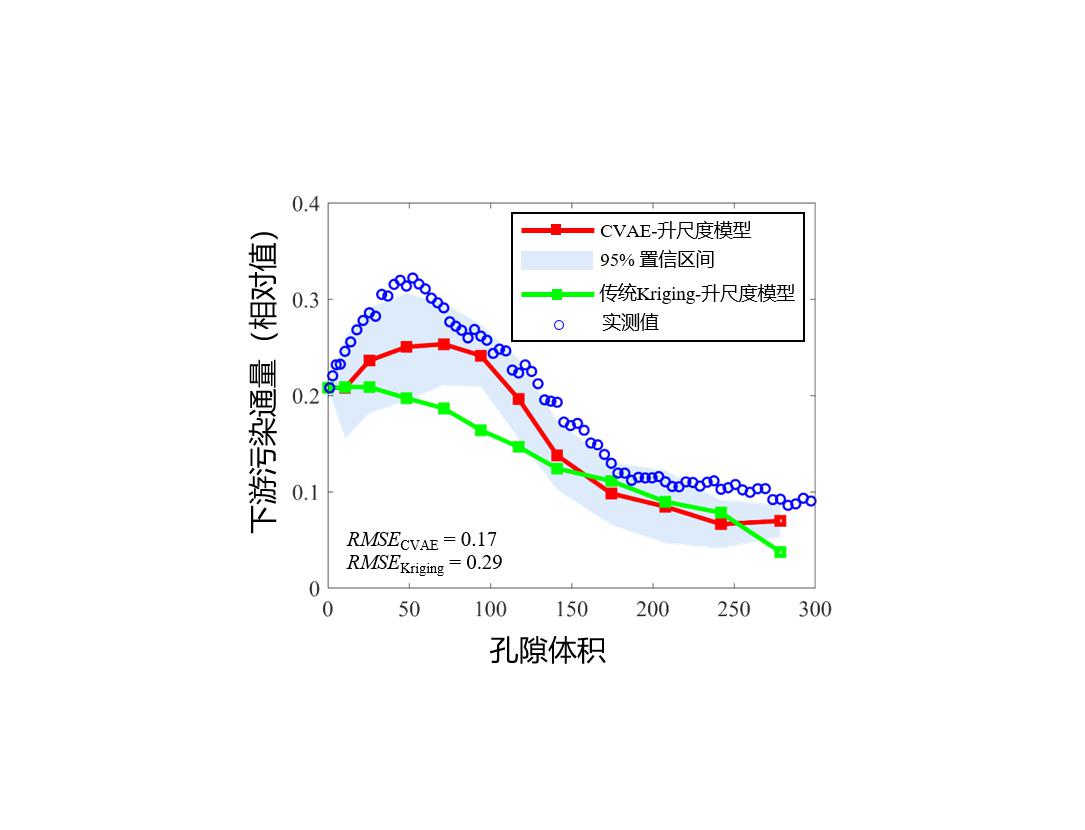 基于二维理想算例与三维砂箱实例,论文对比了传统Kriging方法(基于平滑先验模型)与所提出方法的污染源区推估结果及污染通量预测结果,见图2与图3。结果表明:(1)深度学习方法(CVAE)可有效习得DNAPL复杂的空间结构特征,进而作为物理性先验约束反演过程从而更精细地刻画污染源区结构(针对三维砂箱实例,污染源区的估计误差比传统Kriging方法下降47%);(2)结合CVAE与升尺度模型,可更准确地预测DNAPL的复杂多阶段溶解过程并精准评估污染通量。