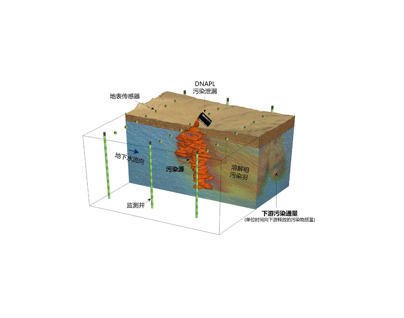 DNAPL污染精细三维刻画对修复治理方案制定有重要指导意义:场地污染刻画精度提高或减少几米,实际工程量可能产生成百上千立方的差距,修复成本可能相差几千万甚至超过亿元。此外,污染场址刻画精度还将影响其环境风险评估结果。DNAPL污染物的环境风险(即下游污染羽对受体的危害程度)通常由下游截面溶出的污染通量来表征(见图1)。低精度刻画易导致DNAPL的漏估,进而低估环境风险(污染通量),从而难以有效管控污染物。