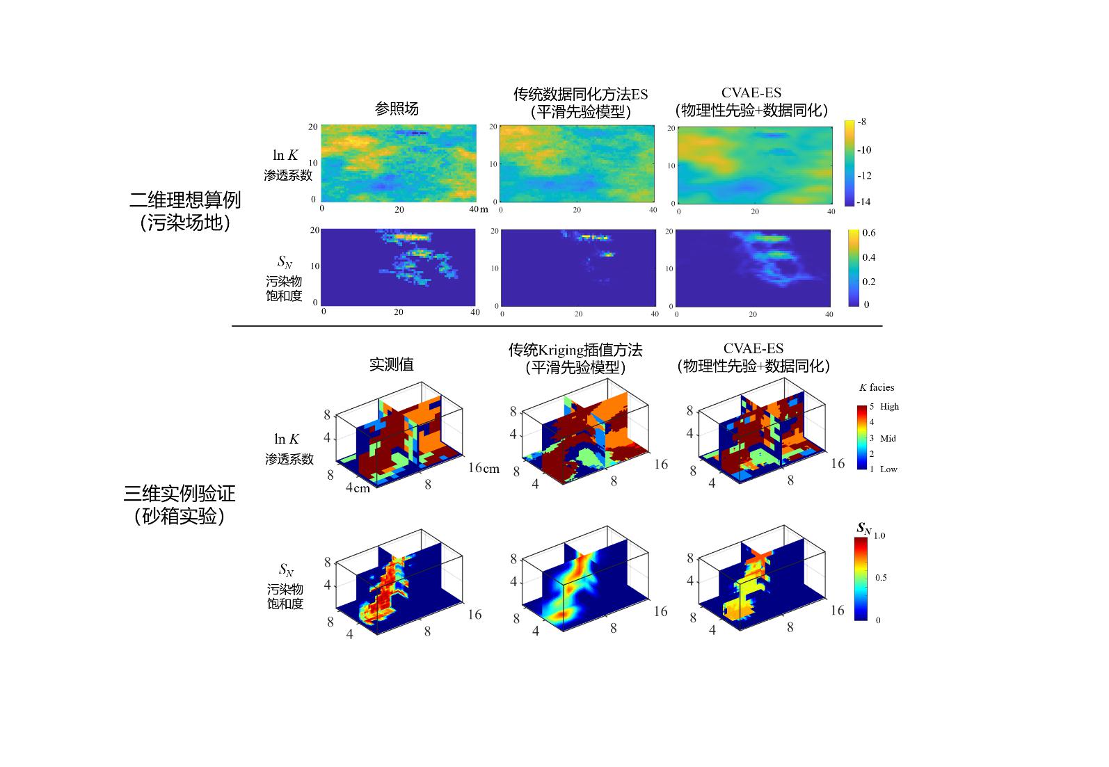 图2. 不同方法推估渗透系数及污染物饱和度场结果对比(二维理想算例及三维砂箱实验)