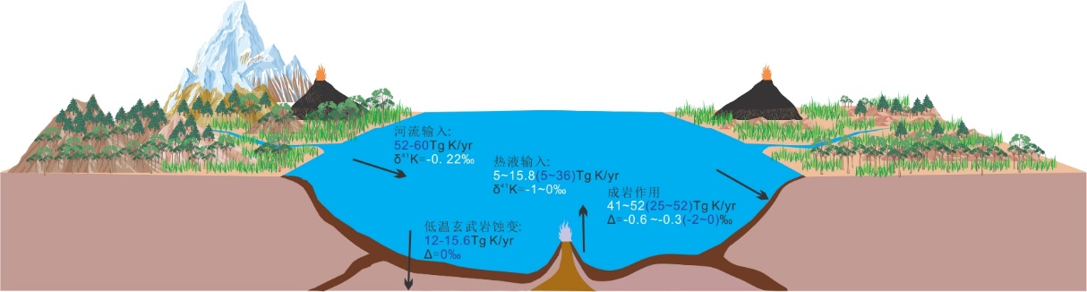 图1. 本研究估算的K循环通量与同位素组成(白色字体)与前人报道数值(蓝色字体)的对比