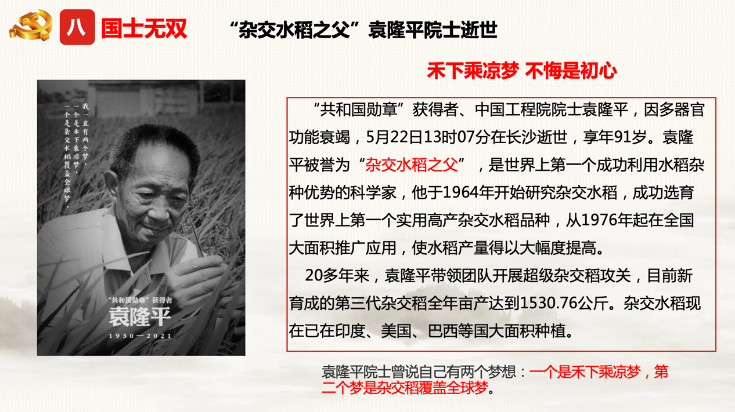 从袁隆平院士离世的媒体反应,到袁院士等科学家的探索奉献精神对科研工作和价值追求的启发;从印度新冠对人类命运共同体的进一步认识到巴以冲突引发的对世界局势的看法,与会党员针对国内外大事要闻开展了热烈讨论。