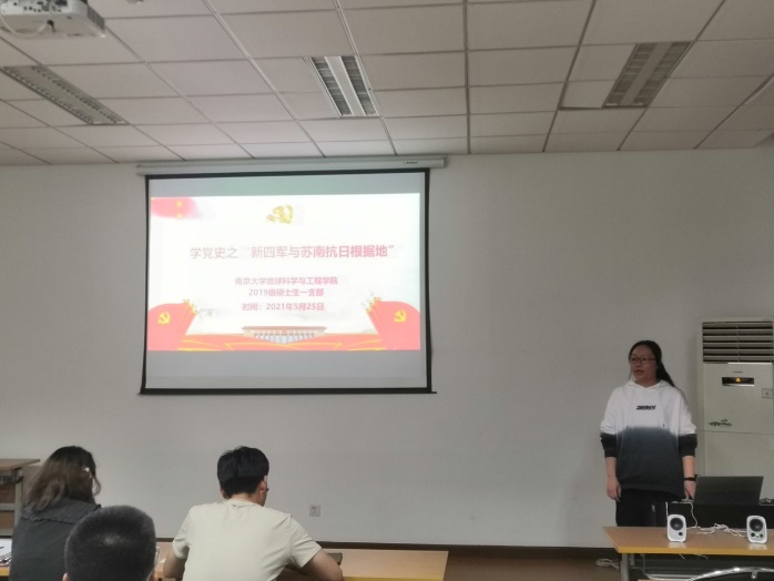2021年5月26日,2019级硕士一支部开展了主题为“顾党史·议今事”的主题党日活动。此次主题党史是本支部“三味”党日系列活动的一部分,除了每月例行的国内外时事分享活动外,作为六月份新四军江南指挥部的线下调研的先导学习,支部书记查日环开展了以“新四军与苏南抗日根据地”为主题的党课,进一步营造了支部学史明理、学史增信、学史崇德、学史力行的党史学习氛围。