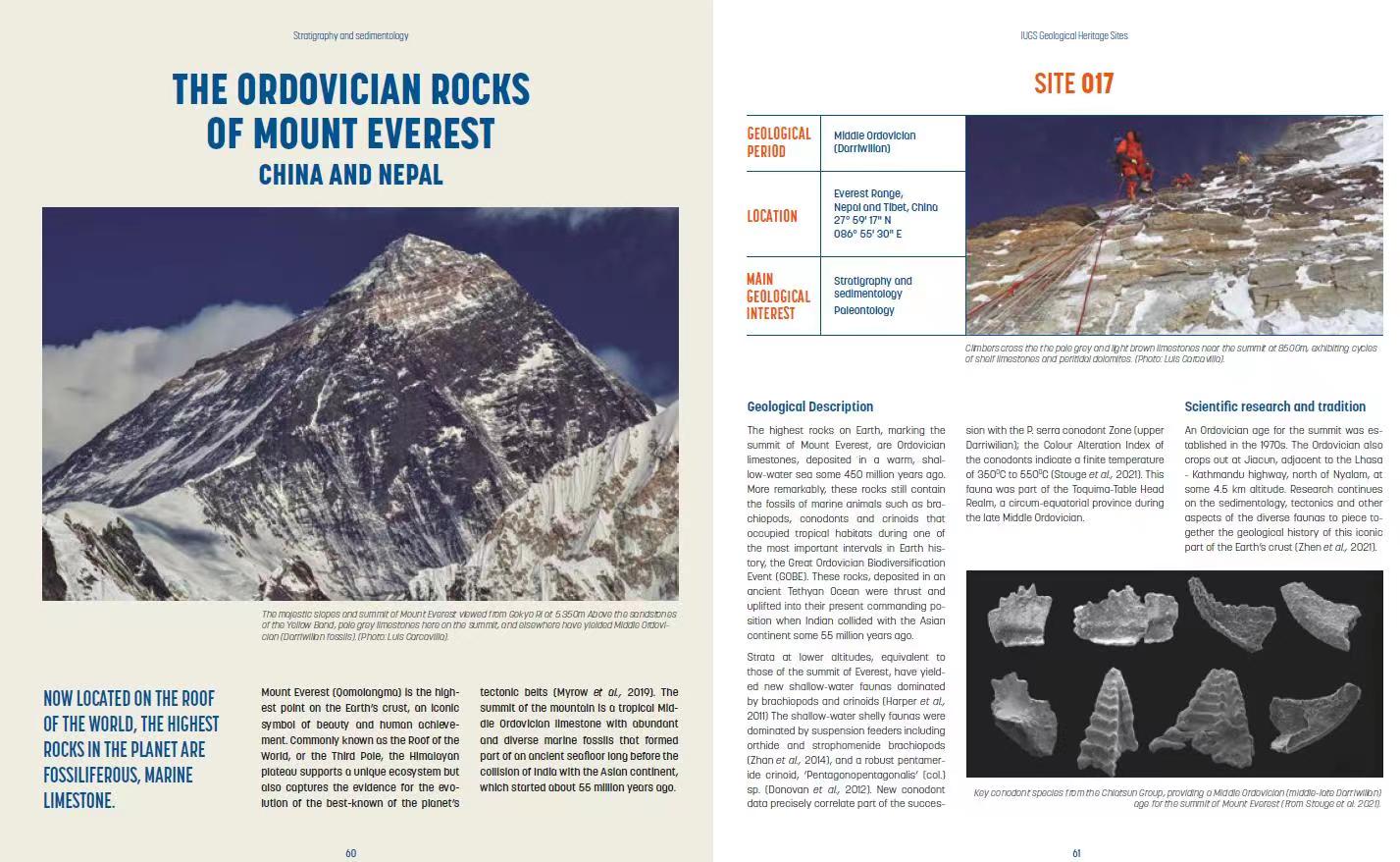 珠穆朗玛峰山顶的奥陶纪岩石是在二十世纪七十年代由中国科学院领导的团队在该地区进行了详细的测绘和采样后确定的。而今,相关研究仍然在继续进行,希望能还原出这一地壳标志性部分的地质历史。