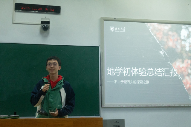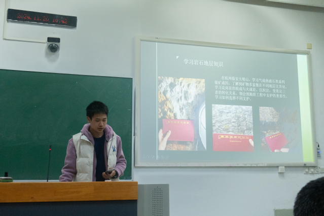 活动伊始,在主持人的活动回顾后,各条线路的队员代表们依次上台,随着PPT的播放,声情并茂地讲述在地学初体验活动中自己的奇妙经历与深刻感想。在他们生动有趣的讲述中,地质现象仿佛活灵活现的画卷,而专业知识如春雨般悄然增长,独特风景恰似绚丽的诗篇,而视野在欣赏中豁然开朗;科考过程宛如刺激的冒险,而实践技能在体验中茁壮成长。每位登场的同学都在“地学初体验”中找到了属于自己的宝藏,并奋力挖掘。他们各具特色的展示,赢得了阵阵雷鸣般的掌声。