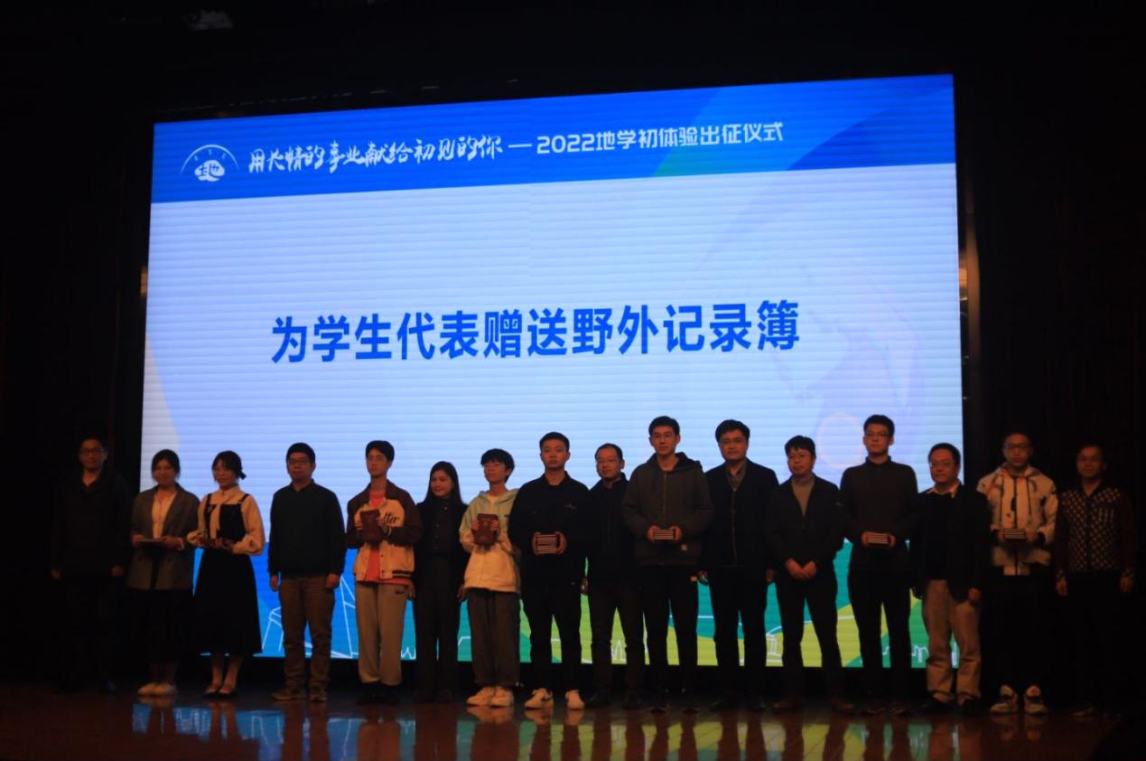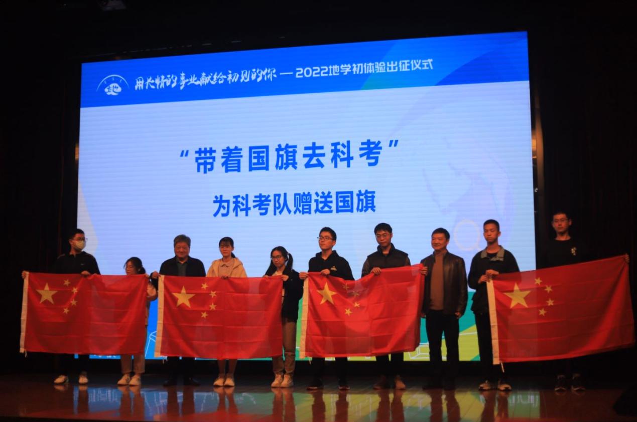 参加地学初体验的同学们离不开前辈的嘱托,更肩负着国家的嘱托。为了践行学院“带着国旗去科考”的传统,王唯和朱国荣为四条路线的学生代表赠送四面国旗。