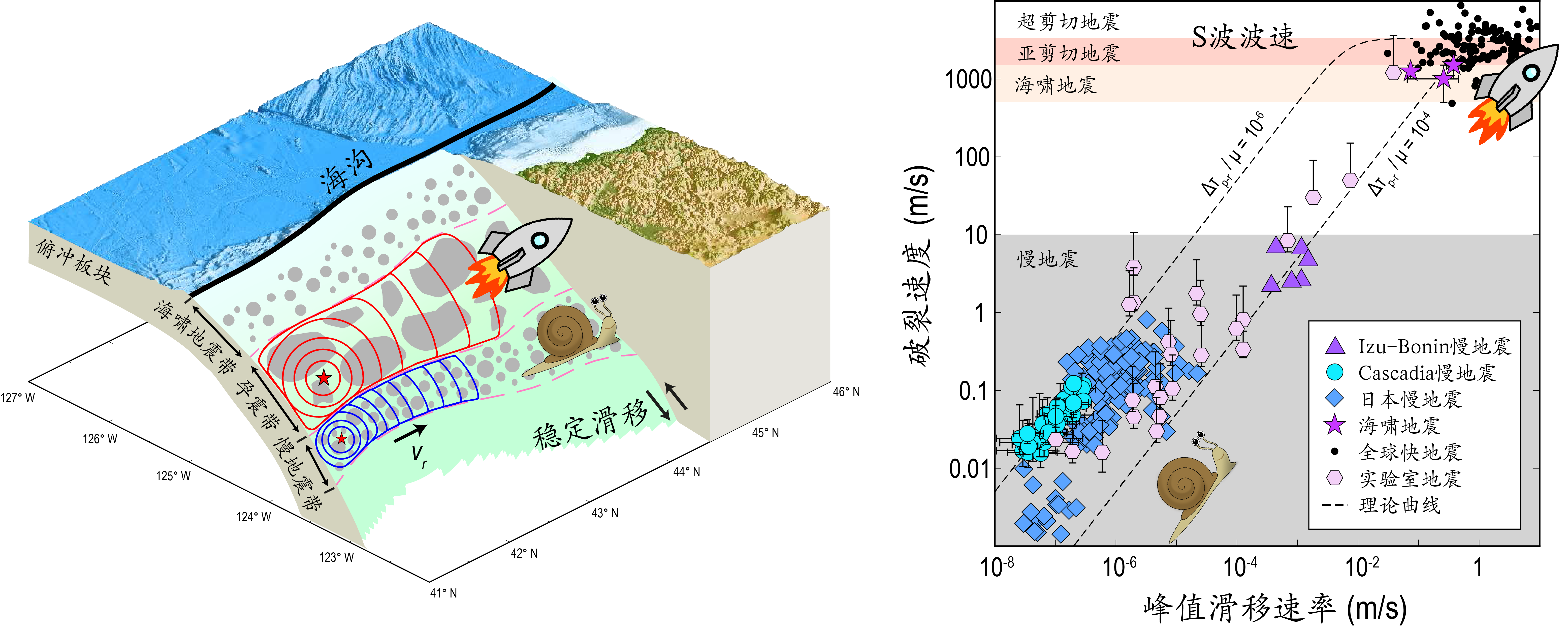 图:俯冲带的慢地震与快地震和全球观测的破裂速度