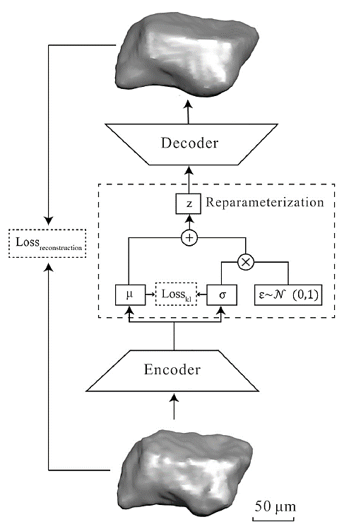 如图2所示,VAE模型由一个编码器与一个解码器所组成。其中,编码器将输入的真实砂粒编码成为一个隐变量,隐变量存在于高维的隐变量空间内,是砂粒三维形态的降维表征。解码器负责将隐变量解码,重建出所输入的砂粒。对于整个训练集,VAE通过重参数化操作,对所有隐变量进行高斯随机采样并计算损失函数,从而学习到砂粒集合形态信息的概率分布。同时,训练好的VAE模型可从隐变量空间随机采样,解码重建出新的数字砂粒,这些新生成的砂粒形态均服从砂粒训练集形态信息的概率分布。