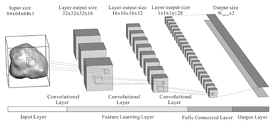 基于以上原理,永利官网张巍副教授课题组以广泛分布于我国长江中下游的南京粉砂为例,采用显微CT扫描少量南京粉砂样品,通过分水岭算法分割出单个砂粒,并使用一个四维张量(即四维矩阵,深度学习与力学中对张量的定义不同)存储单个数字砂粒,其中前三维用于存储颗粒的三维灰度值信息,第四维用于存储图像的通道数信息。如图1所示,将表征数字砂粒的四维张量输入卷积神经网络,最终输出一个包含砂粒形态隐式分布特征的二维张量。使用砂粒集合所有这些二维张量即可构建训练数据集。
