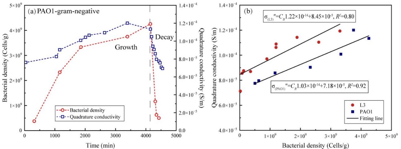 图2. (a)实验过程中细菌数量和异相电导率随时间变化,以铜绿假单胞菌(PAO1)为例;(b)不同菌株数量与异相电导率之间的线性关系