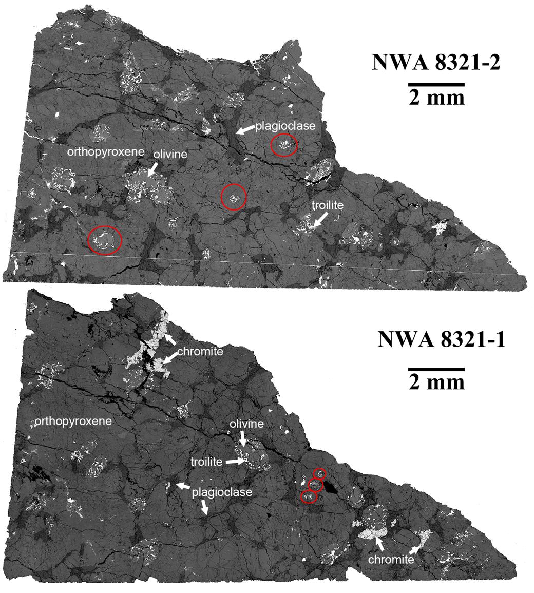 Northwest Africa 8321(简称NWA 8321)是一块主要由顽火辉石组成的非角砾岩Diogenite陨石(如图2)。NWA 8321是国际陨石学会给这块陨石的名字;非角砾岩是具有原生火成或者变质结构的岩石。最近,张爱铖教授领导的团队研究了这块陨石的氧同位素和铬同位素组成,发现这块陨石确实是一块Diogenite类型的灶神星。但他们发现这块陨石有两个特征不同于典型的Diogenite陨石。一是NWA 8321陨石中长石的含量明显高于常见的Diogenite陨石,可以超过10 vol%;二是这块陨石中铁硫化物(FeS,陨硫铁)具有成群分布的特征(如图3)。