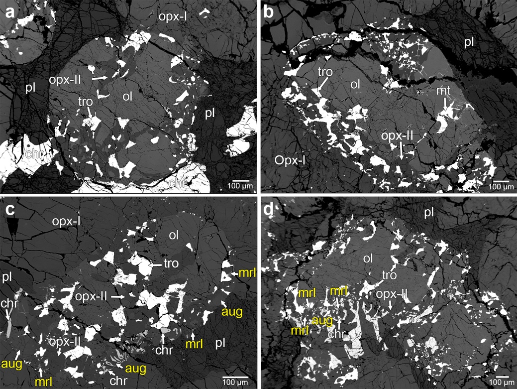 图4、NWA 8321陨石中铁的硫化物和顽火辉石交代橄榄石的岩相学特征。
