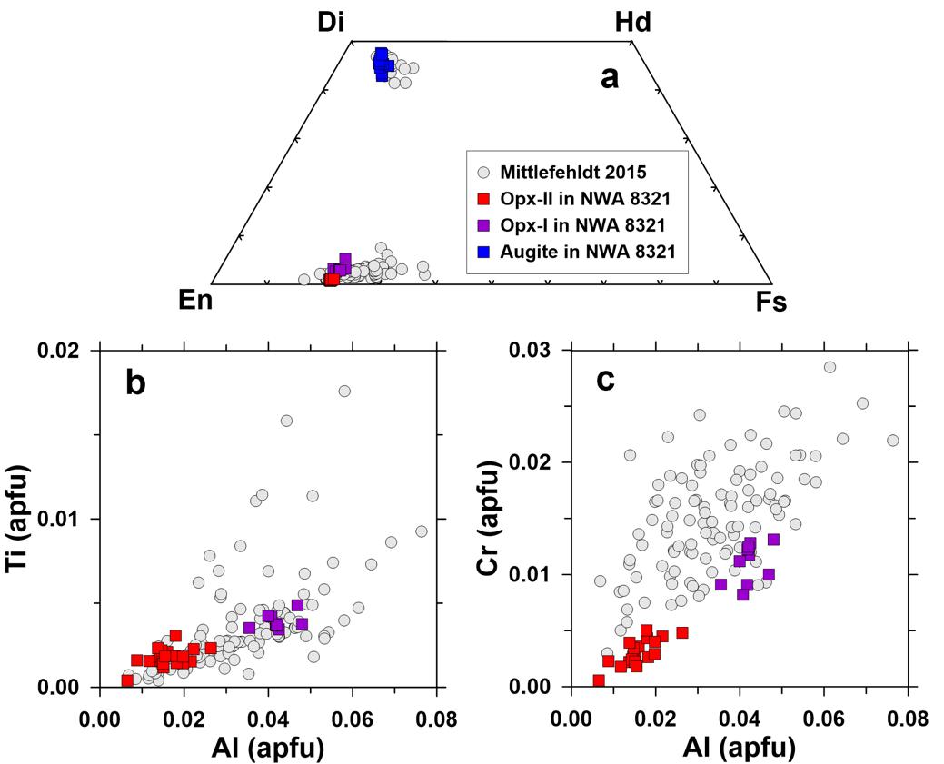 图5、NWA 8321中辉石的成分特征以及和文献中其他Diogenite陨石中辉石成分的对比。