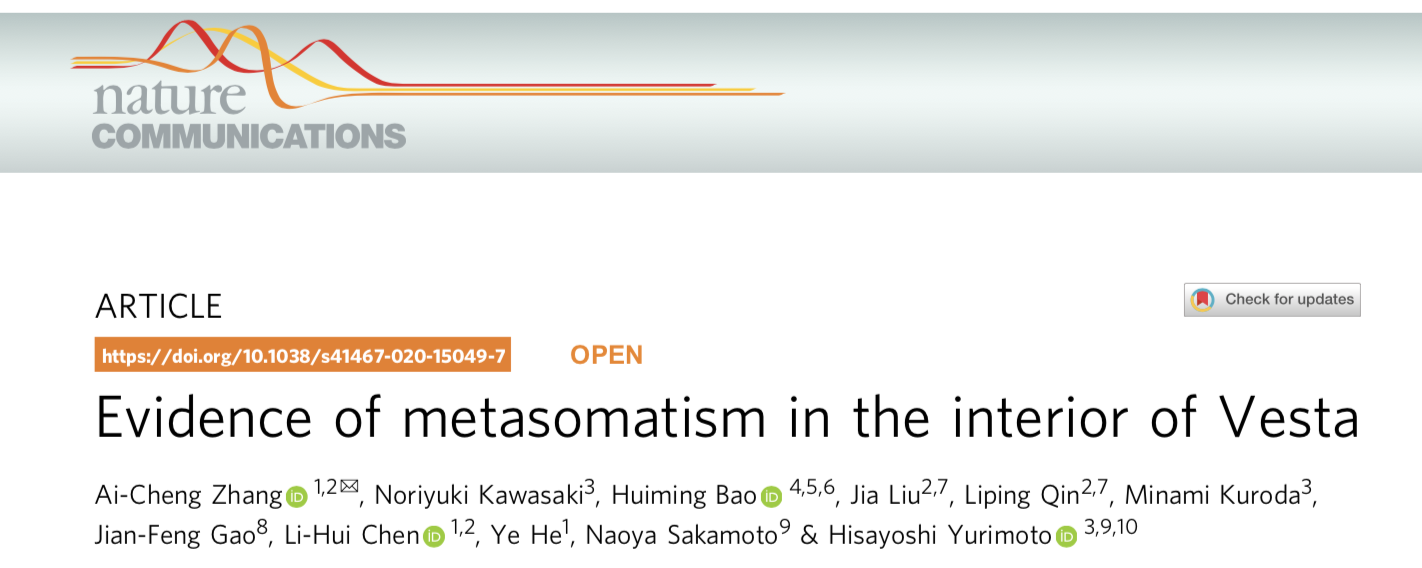 国际知名期刊Nature Communications于3月10日在线发表了永利304官网唯一张爱铖教授课题组关于灶神星陨石研究的最新成果”Evidence of Metasomatism in the Interior of Vesta”。