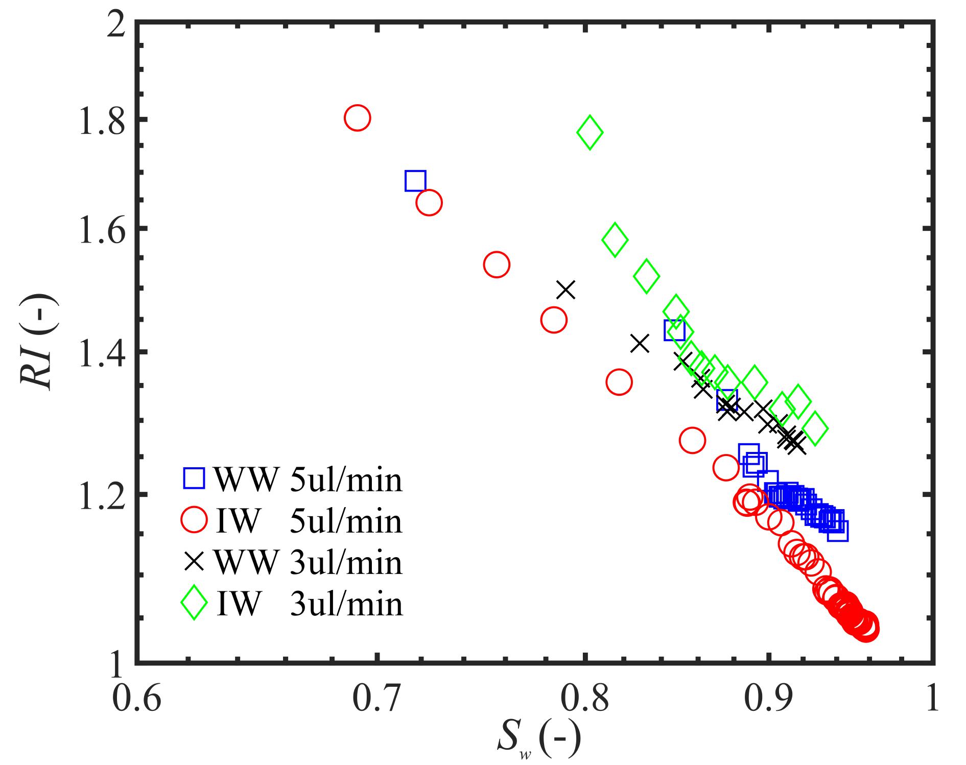 本研究制作了具有不同润湿性的二维微孔隙模型,在可视化实验条件下测量了NAPL驱替过程中的电阻率和NAPL形态变化,进而探讨了孔隙中残留NAPL形态对电阻率影响的内在机理。如图1所示,由于润湿性不同,以相同速度向微模型注入盐水进行驱替后,不同介质中残留的NAPL分布会出现差异。即使在微孔隙模型中的NAPL饱和度相同的条件下,其电阻率响应也会出现偏差(图2)。