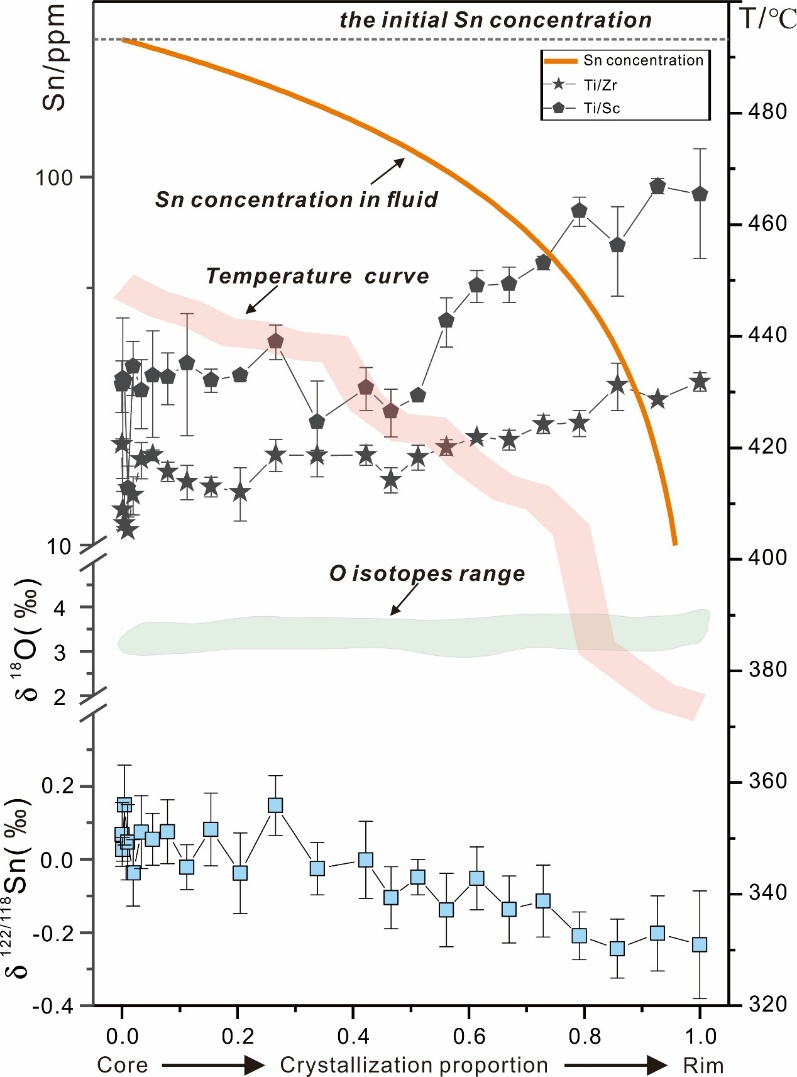 实验结果显示,CL暗区相对于CL亮区显著富集W,Nb,Ta等元素,并表现出更重的锡同位素组成。由于CL暗区不是分布在某个晶体方向,为此,单纯依赖传统晶面取向所形成的protosite模型难以解释“CL暗区更重且富集特定元素”的特征。本研究提出晶面交界带更易形成位错与晶格缺陷等局部结构复杂性,这些位置可能促进微量元素的选择性进入,并相对滞留较重的锡同位素,从而在晶体尺度形成稳定而可识别的差异特征。基于从锡石晶体核部向边缘的生长环带的系统分析结果,锡同位素与微量元素呈现协同演化,体现封闭体系中锡石连续结晶的瑞利分馏现象(图2)。