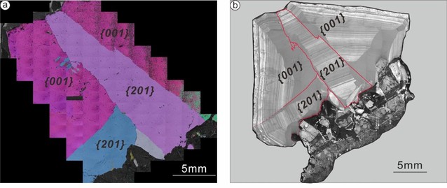 晶体以{001}取向的扇区为主(粉色),中心及下部可见一对与{201}平行的孪晶(紫色与蓝色)。