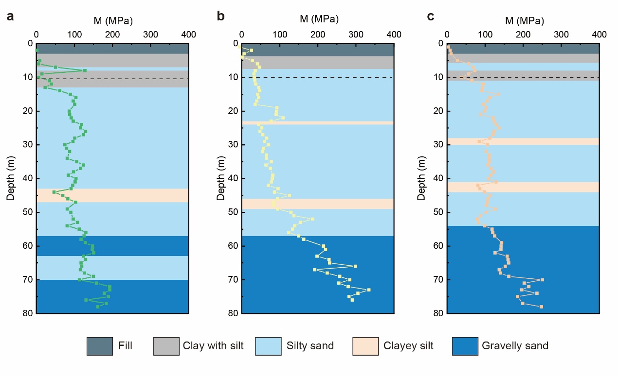 根据分布式光纤应变与孔隙水压力原位感测数据,研究团队创新性地将潮汐力视作天然和可重复的循环荷载源,提出了潮汐力驱动下的原位应力–应变分析方法。通过比对不同深度处的孔压变化与土层应变,绘制出了连续的地层变形模量剖面图(图2),实现了土层变形模量剖面连续和高分辨率的原位刻画。