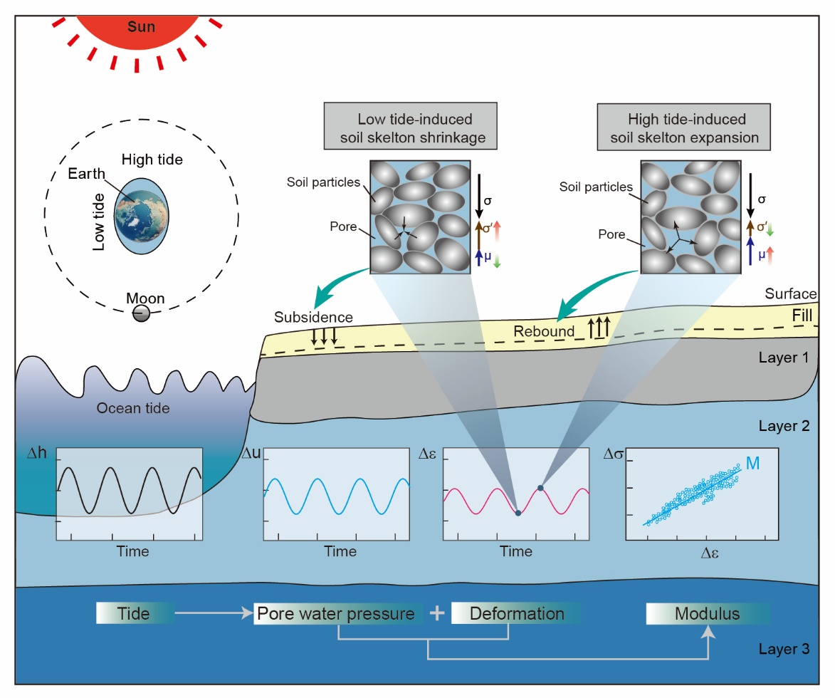 在河口三角洲地区,海洋潮汐不仅驱动河流水位变化,也引起地下水孔隙压力的周期性波动。依据太沙基有效应力原理,孔压变化会导致土层发生微小形变。长期以来,这种“土层潮汐”现象缺乏有效的原位观测手段。