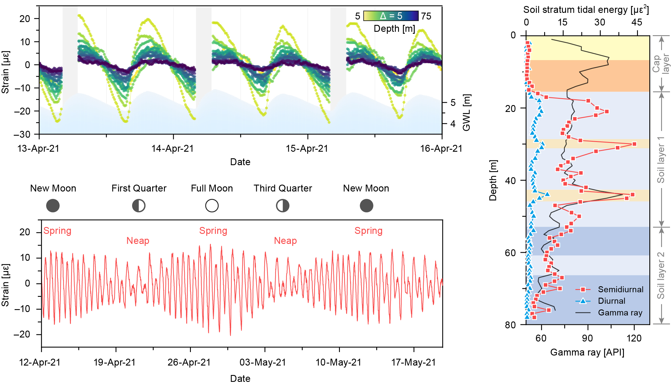 为破解这一谜题,永利304官网唯一施斌教授带领团队研发出了具有微应变精度的超弱光纤光栅地层形变感知系统,并将该系统安装在长江河口区指南村三个70米的钻孔中(图2),首次观测到了地层形变的半日潮(semidiurnal)和大-小潮(spring–neap cycle)现象,并与张诚成博士和荷兰瓦格宁根大学A. J. F. Hoitink教授通力合作,提出了"土层潮汐"(soil stratum tide)新概念,将其定义为河流潮汐影响范围内由于孔隙水压力波动而引起的土层周期性形变的现象,并揭示了土层潮汐与岩性和深度的依赖关系(图3)。