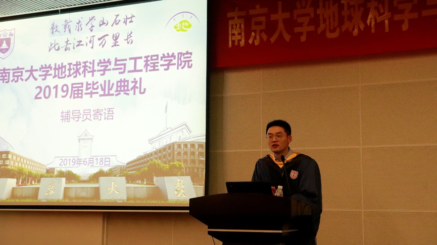 首先永利304官网唯一党委书记王唯老师发表致辞,代表学院向顺利完成学业的2019届68名本科生、102名硕士研究生、24名博士研究生表达了最热烈的祝贺和最衷心的祝福,向辛勤哺育学生的父母、辛勤教导学生的老师表达了最诚挚的感谢和崇高的敬意。王书记总结肯定了本科生四年里通过勤奋进取和执着追求在知识积累、实践训练等方面取得的可喜成绩,学院为之感到欣慰和自豪。四年里,本科同学一起学习、一起野外实习、一起举办学生活动、一起参与科研实践,获得了江苏省先进班集体、永利304官网唯一五四红旗团支部等荣誉,有50%以上同学参加过科研创新项目,9名同学获得国家级奖项,14名同学获得省级、校级各类奖项,52名同学获得过各类奖学金,4名同学将赴耶鲁大学、加州大学伯克利分校等境外一流高校深造,35名同学被南大、北大、中科院等国内一流高校或科研院所录取为研究生,10多名同学受到用人单位的青睐。硕士和博士研究生中,大多数同学即将走上工作岗位,部分同学继续深造。对研究生为地科院的学术科研发展以及如今的学术和社会影响所做出的重要贡献表达了感谢,对毕业生们取得成绩和表现出的风采感到骄傲和自豪。对毕业生提出了新的希冀,希望南大地科院的毕业生们在走向社会之后,能够始终牢记南大“诚朴雄伟,励学敦行”的校训,进一步发扬南大人“嚼得菜根,做得大事”的精神,以国家民族为己任的胸怀,怀揣高远志向,脚踏实地,在实现中国梦的伟大实践中,放飞青春梦想,满腔热情地投入到祖国的建设中。母校和母院永远是同学们事业发展的坚强后盾,欢迎大家常回家看看!