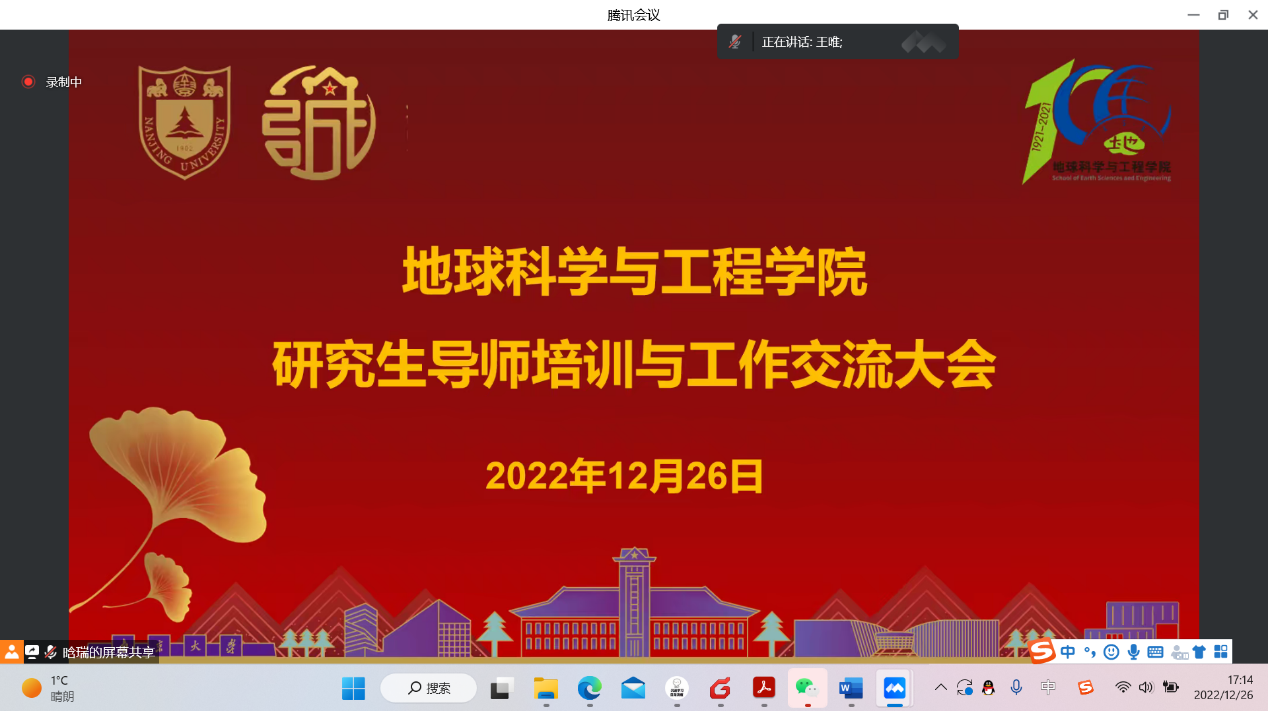 学院分管研究生工作的王孝磊副院长着重从年度工作、导师注意要点和学生反馈三个角度做了报告。他首先介绍了2022年度学院研究生招生、培养和学位工作情况,全年研究生工作抓关键节点、抓过程监控、抓关键少数,秉持严控标准、严格流程、严肃反馈,做到了数量与质量上的稳步提升。随后王孝磊副院长带着导师们学习了教育部有关师德师风的规定,解读了教育部及学校对研究生导师的基本素质要求和立德树人职责,并结合案例对研究生培养过程中导师们需留意的工作要点进行了提醒,他强调在研究生入口到出口的全链条育人过程中,导师们要坚持质量优先,因材施教,严控标准,注意工作边界,确保政策、制度和措施在指导环节落地见效。最后王孝磊副院长对近期“大讨论”中研究生反映较多的问题对导师们进行了反馈,希望导师们在师生交流、论文选题、培养指导、毕业就业等方面,用足够的关心和爱心,落实立德树人根本任务,抓好全过程高质量育人,为培育出引领未来的地学栋梁人才做出新贡献。