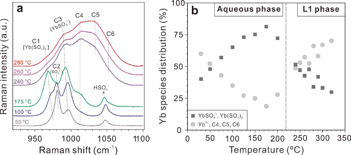 图2. 原位拉曼光谱分析揭示的含硫酸盐热液中REE3+的不同迁移形式(a)和不同形式的络合物携带REE的百分含量(b)