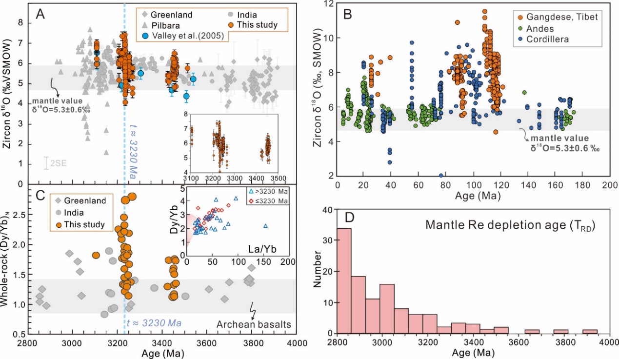 (A) 目前报道的TTG的锆石δ18O随年龄的分布图,小图展示本文数据的详细分布;(B) 典型显生宙大陆弧地区岩浆岩的锆石δ18O值变化;(C) TTG岩石的全岩Dy/Yb随年龄变化图;(D) 地幔Re亏损模式年龄(TRD)分布图展示在3230 Ma起有一个快速生长。