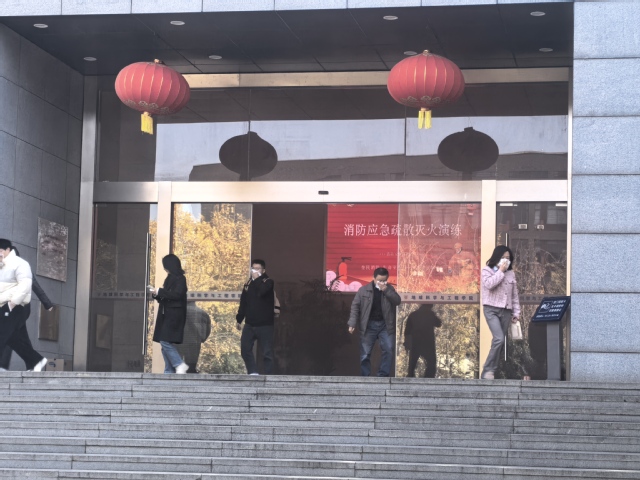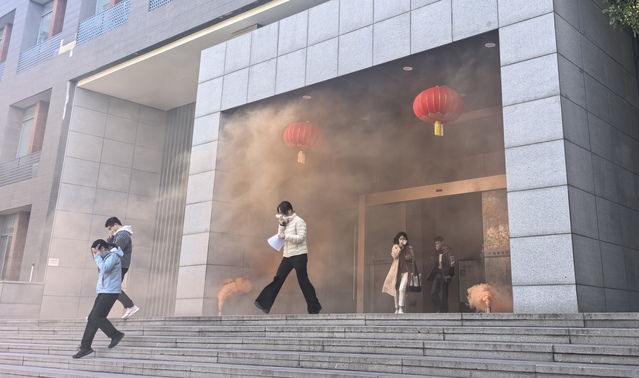 演习过程中,当五楼模拟烟雾触发警报后,实验室师生反应迅速,沉着应对。大家严格按照预定方案,用湿巾捂住口鼻,低姿弯腰,沿疏散路线快速有序地撤离。在各楼层引导疏散员的有效指挥下,全体人员未出现拥挤、慌乱现象,在规定时间内安全抵达指定集合地点,整个过程紧张有序,达到了预期效果。