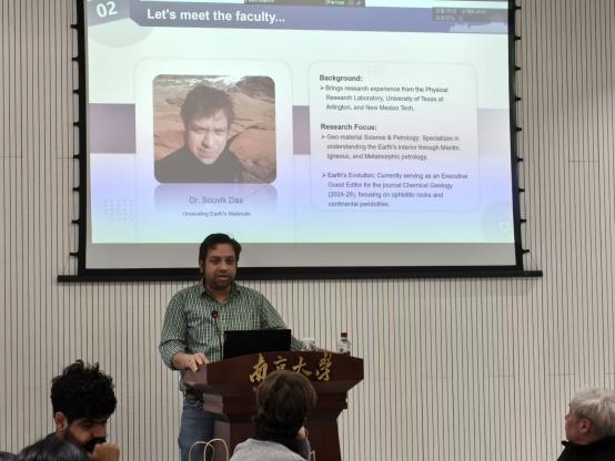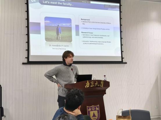 在教师分享环节,五位外教依次介绍了各自的求学经历与研究领域:Alexander Nemchin教授以宇宙化学为主题,阐述了地质学研究的基本方法;Shohei Hattori副教授从地球化学角度,展望了稳定同位素地球化学分析方法的发展前景;Das Souvik博士后结合地球材料科学与岩石学,生动解析了该领域的前沿动态;Victor Ribeiro博士后与Alessandro Paolo Carniti博士后则分别从古生物学出发,介绍了各自的研究重点与发展方向。分享内容翔实生动,不仅帮助同学们了解不同领域的研究方法与趋势,也激发了大家的科学思考,增进了对外教团队的初步认识。