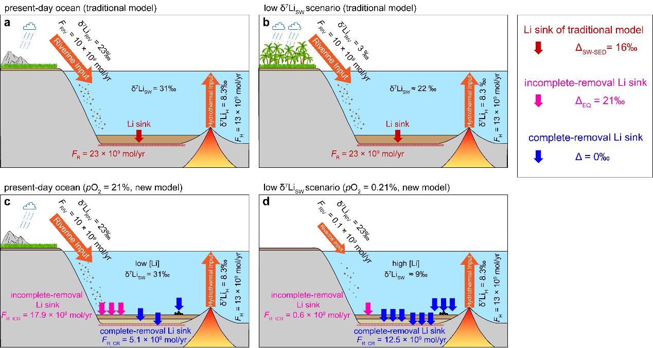 图1传统模式和该研究构建的“两种概念锂汇”模式下的现代海水δ7Li值(31‰)和古海水低δ7Li值示意图。在传统模式(a, b)中,仅考虑河水锂输入的δ7Li变化,其余源汇通量和同位素分馏值保持不变。该研究构建的“两种概念锂汇” 模式(c, d)将海水锂汇区分为完全移除汇与不完全移除汇,两者通量随大陆风化通量和海水锂含量变化而变化。