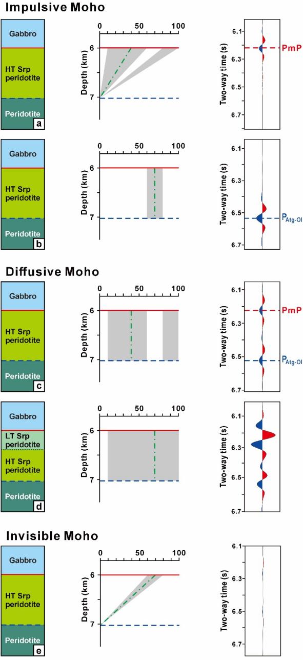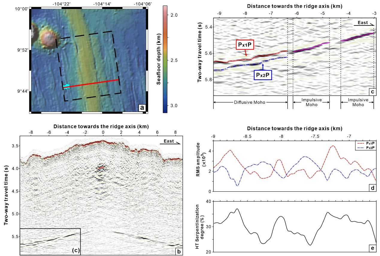 莫霍面是全球范围内的波速不连续面,被作为地壳与上地幔的边界。由于组成洋壳的辉长岩与地幔橄榄岩具有显著的波速差异,在地震反射剖面上常表现为强振幅脉冲型反射。然而,地震观测发现在扩张速率大于55毫米/年的快速和中速扩张洋中脊,莫霍面的反射特征可分为脉冲型、叠瓦型、弥散型和弱(无)反射(Carton et al.,2020),其成因存在广泛争议。