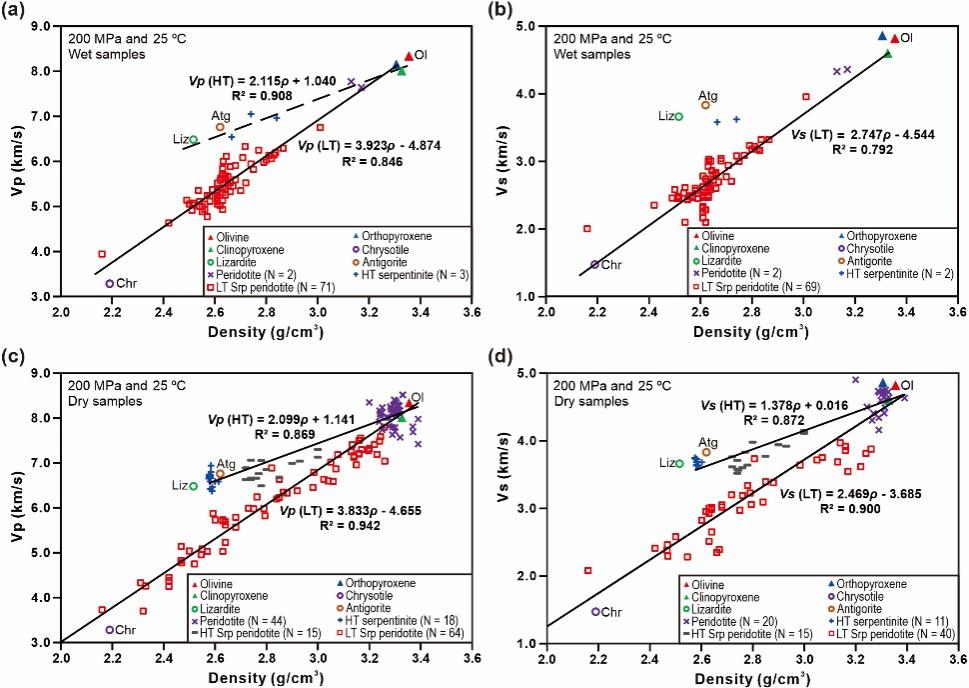 图2. 200 MPa压力和室温条件下蛇纹石化橄榄岩的地震波速与密度相关关系