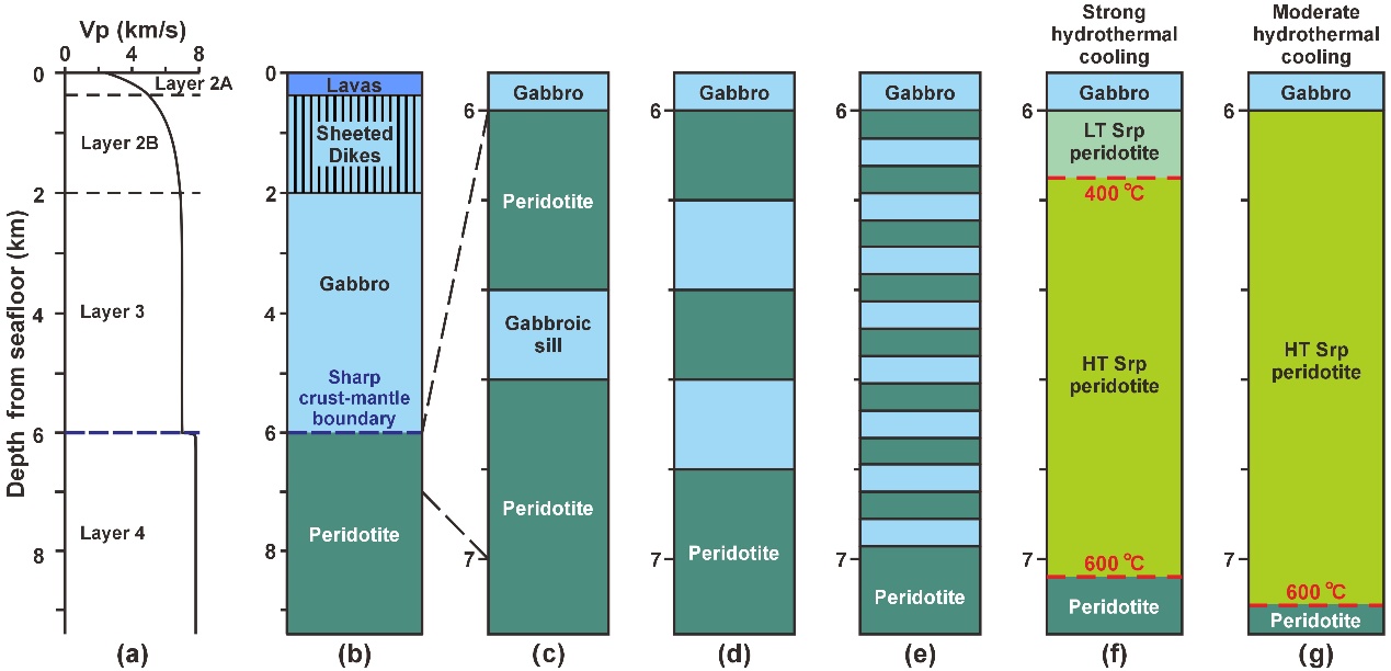 图1. 典型快速洋中脊的(a)地震波速剖面(Vithana et al., 2019)和(b)岩石学模型(Dilek & Furnes, 2014),(c-e)层状过渡型壳幔边界模型,(f)强烈水热循环作用下,上地幔顶部会依次出现低温蛇纹石化(纤蛇纹石和利蛇纹石稳定域,<400 ºC)和高温蛇纹石化(叶蛇纹石稳定域,400–600 ºC);(g)中等水热循环作用下,上地幔顶部只出现高温蛇纹石化。