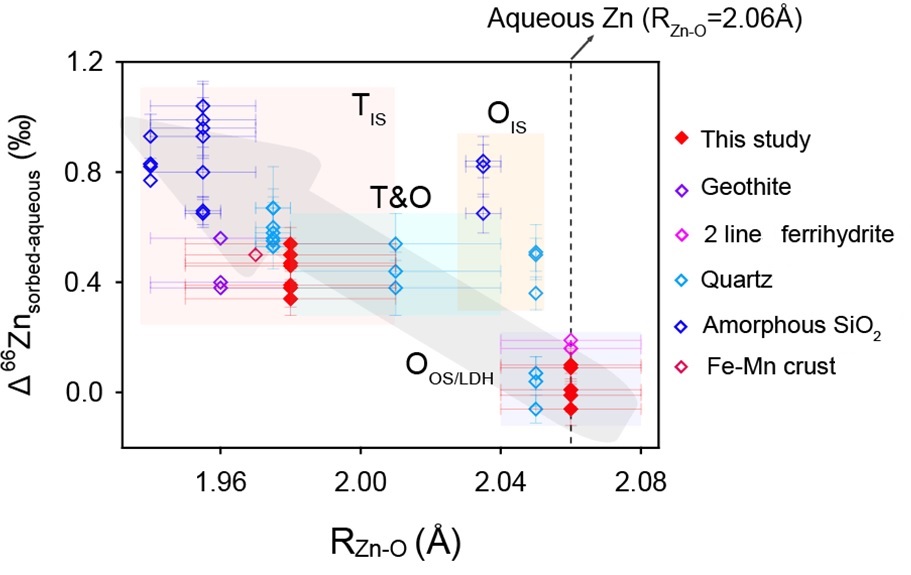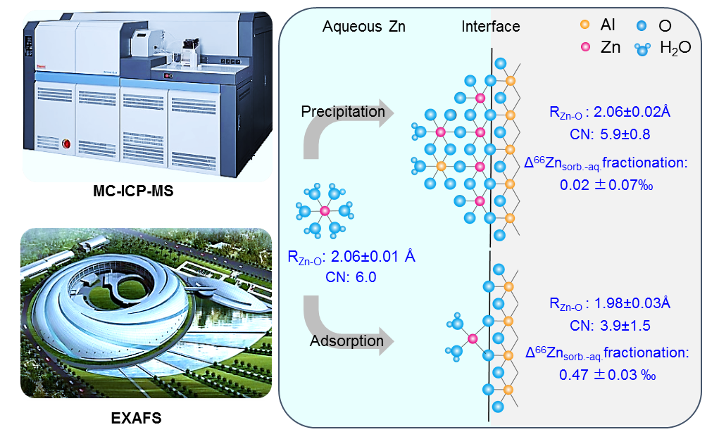 鉴于此,永利304官网唯一李伟教授和李伟强教授合作,结合各自在同步辐射技术与同位素地球化学上的专长,开展了Zn同位素在氧化铝-溶液界面吸附过程中的同位素分馏机制研究。研究团队在永利304官网唯一建立了高精度Zn同位素分析方法(长期外部误差为0.04‰),分析能力达到了国际一流水平。研究结果表明,不同吸附密度条件下,Zn同位素的吸附分馏程度差异较大。低吸附密度(Г≤0.75μmol/m2)条件下,重的Zn同位素优先被氧化铝表面吸附,Δ66Znsorbed-aqueous=0.47±0.03‰;高吸附密度(Г≥1.59μmol/m2)条件下,吸附相和残余溶液相几乎不发生Zn同位素的分馏(Δ66Znsorbed-aqueous=0.02±0.07‰)。为了从分子水平揭示上述Zn同位素吸附分馏差异的机制,研究团队依托国家大科学装置开展了基于同步辐射的扩展X射线吸收精细结构光谱技术(EXAFS)研究,从分子水平解析了Zn在不同地球化学条件下的吸附结构(配位构型与化学键长)。EXAFS是一种原子团