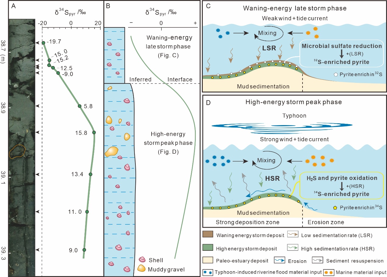 中国东部沿海平原地区晚第四纪下切河谷内保存有完整的晚第四纪沉积地层,是研究海陆相互作用的代表性区域。课题组首次在晚第四纪钱塘江下切河谷SE3孔古河口湾环境顶部发现了泥质风暴沉积(厚约62 cm;图1),时代为距今8500~9000年。通过地层、沉积、元素、同位素和有机地球化学等系统分析,不仅有力证实了泥质风暴沉积的存在,并发现其记录到了高能风暴峰期(HESPP)和衰能风暴晚期(WELSP)两个沉积时期。该段泥质风暴沉积物的黄铁矿硫同位素(δ34Spyr)呈现“罕见”变化:HESPP时期δ34Spyr值为+5.8‰~+15.8‰,WELSP时期为−9.0‰~−19.7‰,在厘米尺度内发生了急剧的偏移(图2),从而提供了一个独特的机会来评估风暴对沉积物δ34Spyr特征的影响。我们提出,HESPP时期黄铁矿的34S富集很可能是由于风暴对沉积物的再沉积和高沉积速率的综合作用引起,这涉及到导致34S黄铁矿富集的多种物理和化学过程;相反,在WELSP期间,相对较低的沉积速率和有限再沉积作用使早期形成的富32S黄铁矿的同位素信号得以保存(图3)。因此,δ34Spyr值的显著偏移变化反映了HESPP和WELSP之间沉积条件的巨大变化,表明风暴活动引起的非稳态沉积促进了“重”同位素黄铁矿的形成。这种急剧的δ34Spyr值转变,可以作为泥质风暴沉积物识别的标志性特征。