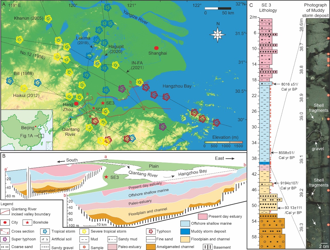 图1 (A) 晚第四纪钱塘江下切河谷及SE3和SE2钻孔位置,以及历年台风移动轨迹 (黑色虚线; 1949至2021年);(B) 晚第四纪钱塘江下切河谷地层与沉积相分布特征; (C) SE3孔岩心与泥质风暴沉积物特征