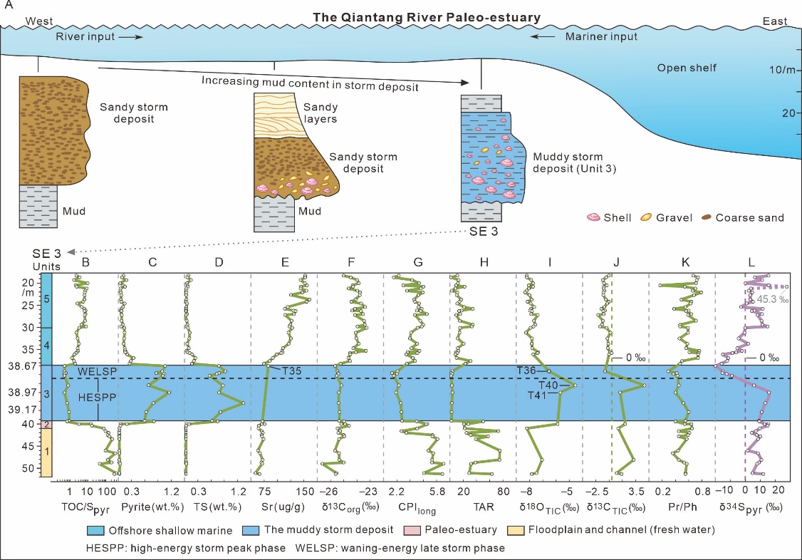 图2钱塘江古河口湾相风暴沉积物发育模式(A)及SE3孔泥质风暴沉积物地球化学特征(B-L)