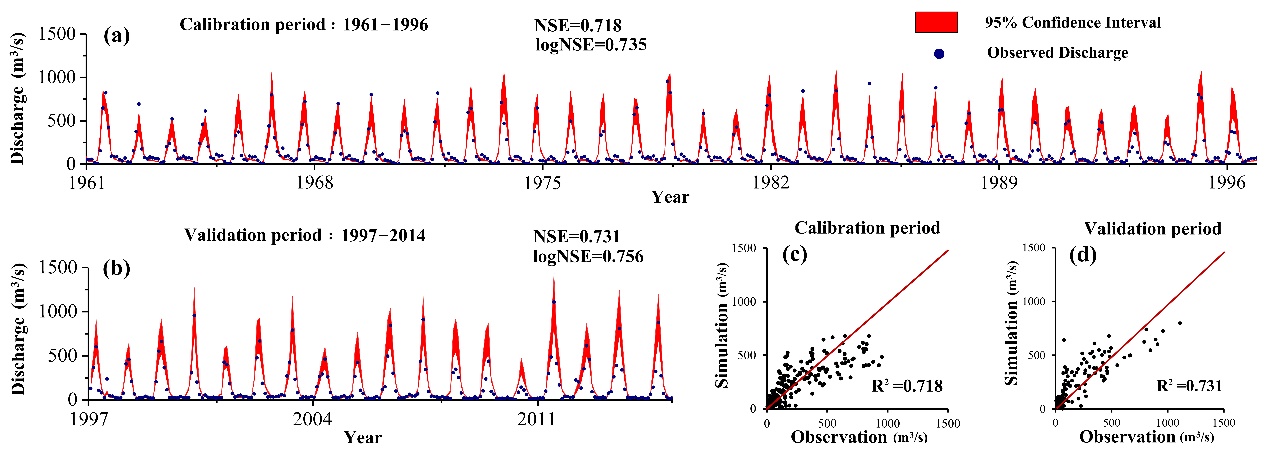 图2 (a)和(b)分别表示识别期和验证期的测站月径流量模拟值和观测值序列,(c)和(d)分别表示识别期和验证期的测站月径流量模拟值和观测值散点图