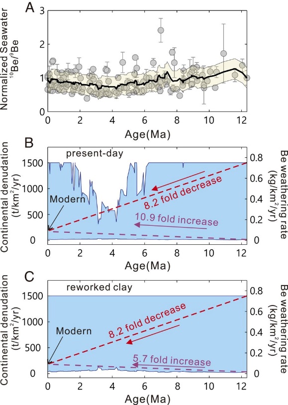 哥伦比亚大学Lamont-Doherty地球观测研究所所长,美国科学院院士Maureen E. Raymo教授于上世纪80年代末提出了著名的“抬升-风化”假说,认为新生代以来,以喜马拉雅山和安第斯山为代表的山脉的隆升造成的大陆物理剥蚀速率的增加,加速了大陆硅酸盐风化过程,驱动了大气CO2浓度的下降,导致新生代变冷和第四纪冰期的来临。该假说的提出极大地推进了新生代风化-碳循环领域的进步,在该假说的启示下,许多科学家开展了大量工作,发现海水Li, Sr, Os 同位素曲线、大洋碳酸盐补偿深度、造山带热年代学数据和深海沉积物通量等一系列新生代地质记录可以有力证明该假说。然而,晚新生代以来海水的Be同位素记录却别树一帜, 前人对其有两种解译结果:一种认为长英质大陆的剥蚀和风化速率在晚新生代均保持恒定;第二种认为其物理剥蚀速率上升,而化学风化速率保持恒定。两种解释均否定了抬升-风化假说。这与其他风化剥蚀指标相矛盾,成为了风化-碳循环领域的一个重要的谜题,得到科学家的广泛关注。
