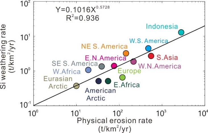 图2. 次大陆尺度上物理剥蚀速率与硅酸盐化学风化速率呈现正相关关系