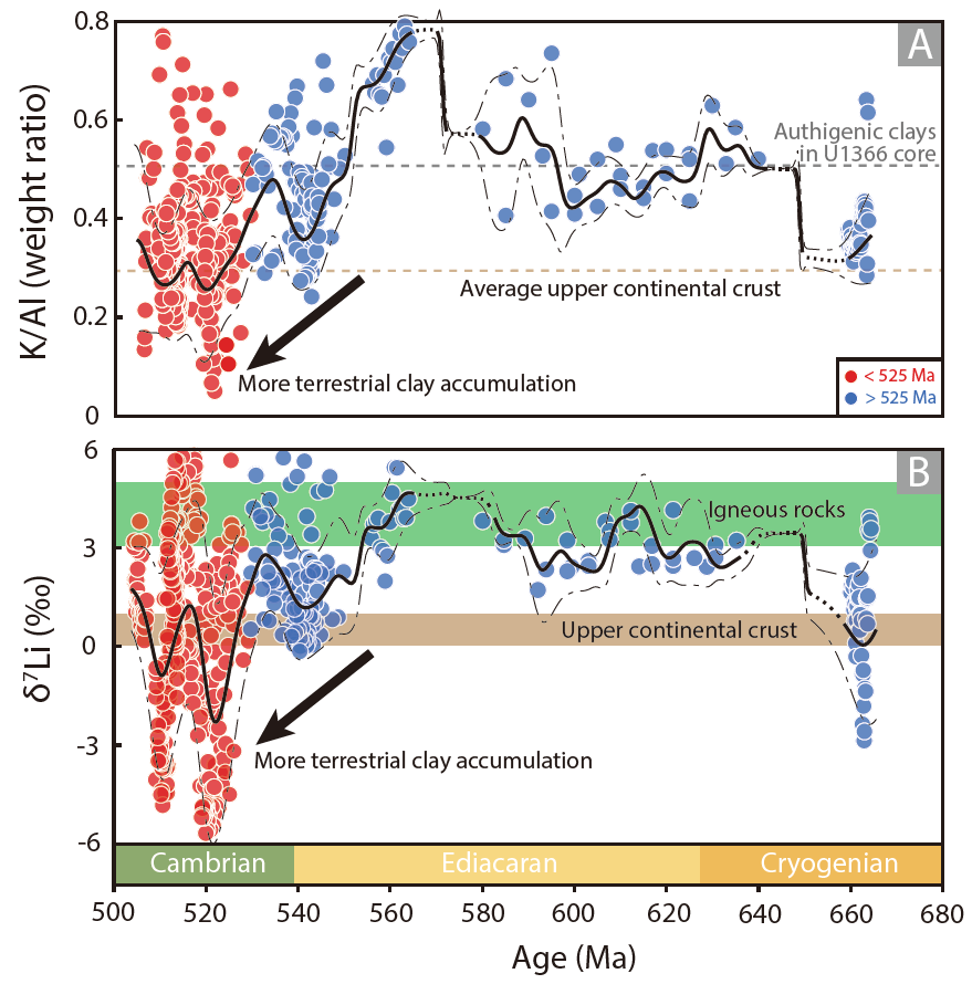 图1. 新元古代末期到寒武纪中期 (ca. 660-500 Ma) 海相沉积泥岩Li同位素和K/Al变化