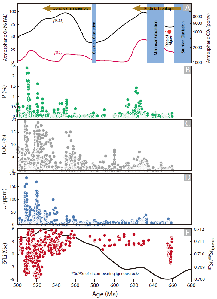 在化学风化过程中,轻的Li同位素优先进入次生硅酸盐矿物中,因此各类黏土矿物记录了偏负的δ7Li信号,而未经化学风化的硅酸盐矿物或弱风化产物(如长石、云母等)则保留了接近原始上地壳组成的δ7Li信号(通常大于或接近0‰),此外海洋反向风化形成的自生黏土,由于其Li的主要来源为海水,通常也记录了偏正的δ7Li信号。由此可见,海相沉积泥岩全岩的δ7Li值可以有效反映不同来源硅酸盐矿物的相对比例。魏广祎副教授在成都理工大学李超教授、中科院南京地质古生物研究所周传明研究员、中国地质大学(武汉)沈俊研究员、美国耶鲁大学Noah Planavsky、Lidya Tarhan教授、波莫纳学院Robert Gaines教授、斯坦福大学Erik Sperling教授等国内外专家学者的合作支持下,系统收集和分析了新元古代末期到寒武纪中期 (约660–500 Ma)全球各地区近600块海相页岩样品的Li同位素及K/Al比值,用以限定这一时期大陆硅酸盐化学风化和陆源黏土形成变化(图1)。Li同位素和K/Al比值数据显示寒武纪早期 (约525 Ma) 之后的泥岩记录了显著变负的δ7Li和较低K/Al比值,指示大陆硅酸盐化学风化增强和陆源黏土在海相沉积物中比例增加。作者进一步对SGP数据库中P, TOC, U含量数据进行汇总分析,发现负的δ7Li信号时段海相沉积岩的P, TOC, U含量出现同步上升,表明大陆硅酸盐风化增强和黏土矿物输入增加与海洋P储库、有机碳埋藏量以及海洋总体氧化水平的上升紧密相关(图2)。通过全球生物地球化学循环模型对黏土矿物输入增加后大气和海洋氧含量变化进行模拟,结果显示在低大气氧条件下(< 20–40% PAL),陆源黏土输入通量增加可以导致大气和深海氧含量的显著增加(图3)。本研究建立了碎屑沉积岩Li同位素体系重建大陆硅酸盐风化和黏土矿物形成的基本框架,发现寒武纪早期陆源黏土形成与海洋营养物质循环、有机碳埋藏及海洋氧化还原状态之间的耦合关系,并通过数据与模型结合的方式论证了黏土矿物在调节海洋生物碳泵和氧化还原状态方面起到的重要作用。
