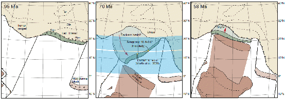 将所获得的日喀则弧前盆地(~86°E经度)18.4° ± 3.6°N的古纬度结果与缝合带西段KLA(~77°E经度)~90 Ma的沉积物源分析及其~66 Ma所处的8.1° ± 5.6°N古纬度结果相结合,在Kapp and DeCelles (2019)的“弧后扩张”模型基础上,提出了亚洲南缘白垩纪晚期“非对称弧后扩张”模型(图3):白垩纪晚期亚洲南缘发生差异性弧后扩张,西端扩张幅度大,向东扩展幅度逐渐减小,导致在西段形成一个三角形弧后盆地,随后弧后盆地关闭。非对称弧后扩张在亚洲南缘形成的KLA-日喀则弧前显示出由洋内弧过度为陆缘弧的特征,这与现代阿留申-阿拉斯加地区洋内弧过度为陆缘弧的特征相似。非对称弧后扩张很可能是由于新特提斯洋板片后撤及环绕其西北端的地幔流动引起的。这一形成过程可能与现代新西兰东北部太平洋板块西向俯冲、后撤导致非对称弧后扩张形成的三角形Lau盆地的过程类似。此外,该模型表明,印度大陆北向漂移与亚洲南缘汇聚的应变不是以往认为的沿缝合带均匀分配的,而是在侧向上很可能存在不均匀分布。
