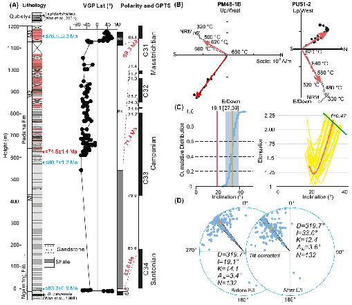 图2 日喀则弧前盆地桑桑剖面古地磁结果。(A)磁性地层结果;(B)逐步退磁结果;(C,D)沉积岩磁倾角浅化矫正结果