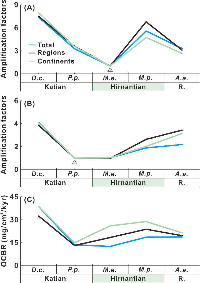 图2. 奥陶-志留纪之交海洋有机碳埋藏的变化规律。(A)与(B)为归一化统计法,(C)为绝对值统计法。