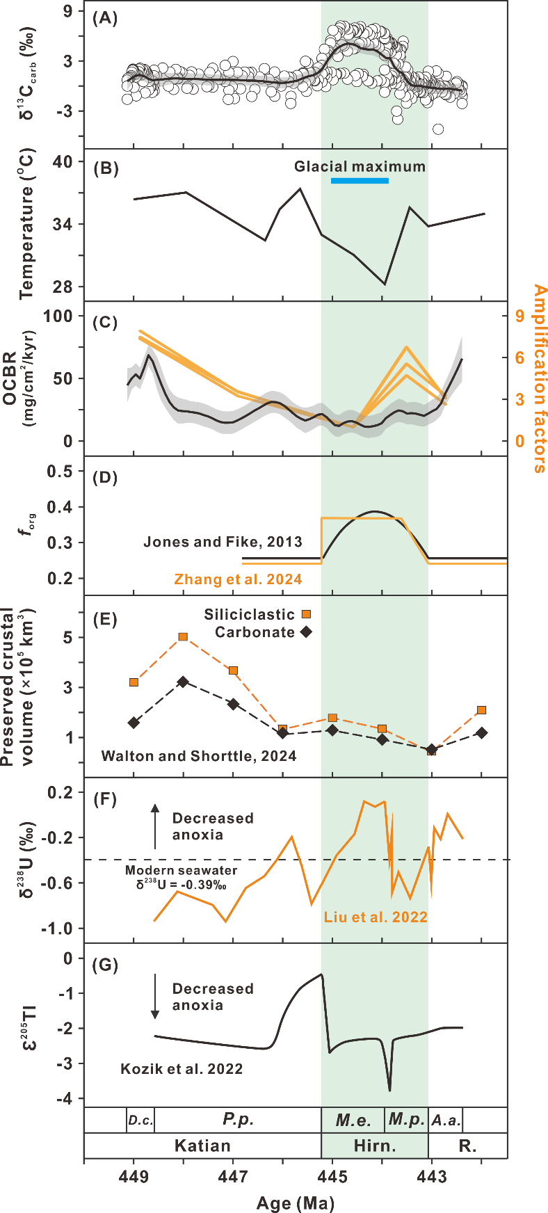 海洋有机碳埋藏作为全球碳循环的重要组成部分,不仅能够吸收大气中的二氧化碳导致气候变冷,还能改变碳循环平衡(稳态),引起海洋碳同位素漂移。基于这一机制,海洋有机碳埋藏的增加曾被广泛认为是驱动赫南特冰期与HICE的关键因素,并为冰盛期与HICE的耦合提供了理论依据。然而,这一假说主要依赖于对碳循环剧烈扰动的理论推演,缺乏有机碳埋藏地质记录的直接证据。此外,最新研究表明,HICE受到海洋碳同位素梯度效应的显著影响(Yang & Fan* et al., 2024, Earth-Science Reviews),这意味着其+7‰的碳同位素漂移可能并不完全反映全球海洋碳循环的剧烈扰动。因此,奥陶-志留纪之交的海洋碳循环过程与赫南特冰期的成因机制仍存在争议,尤其是有机碳埋藏与冰期之间的内在关系尚未明确。