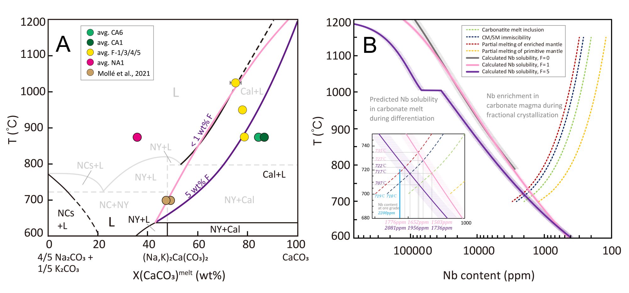 图3 碳酸盐相图(A)及碳酸岩分异过程中铌溶解度的急剧下降(B)