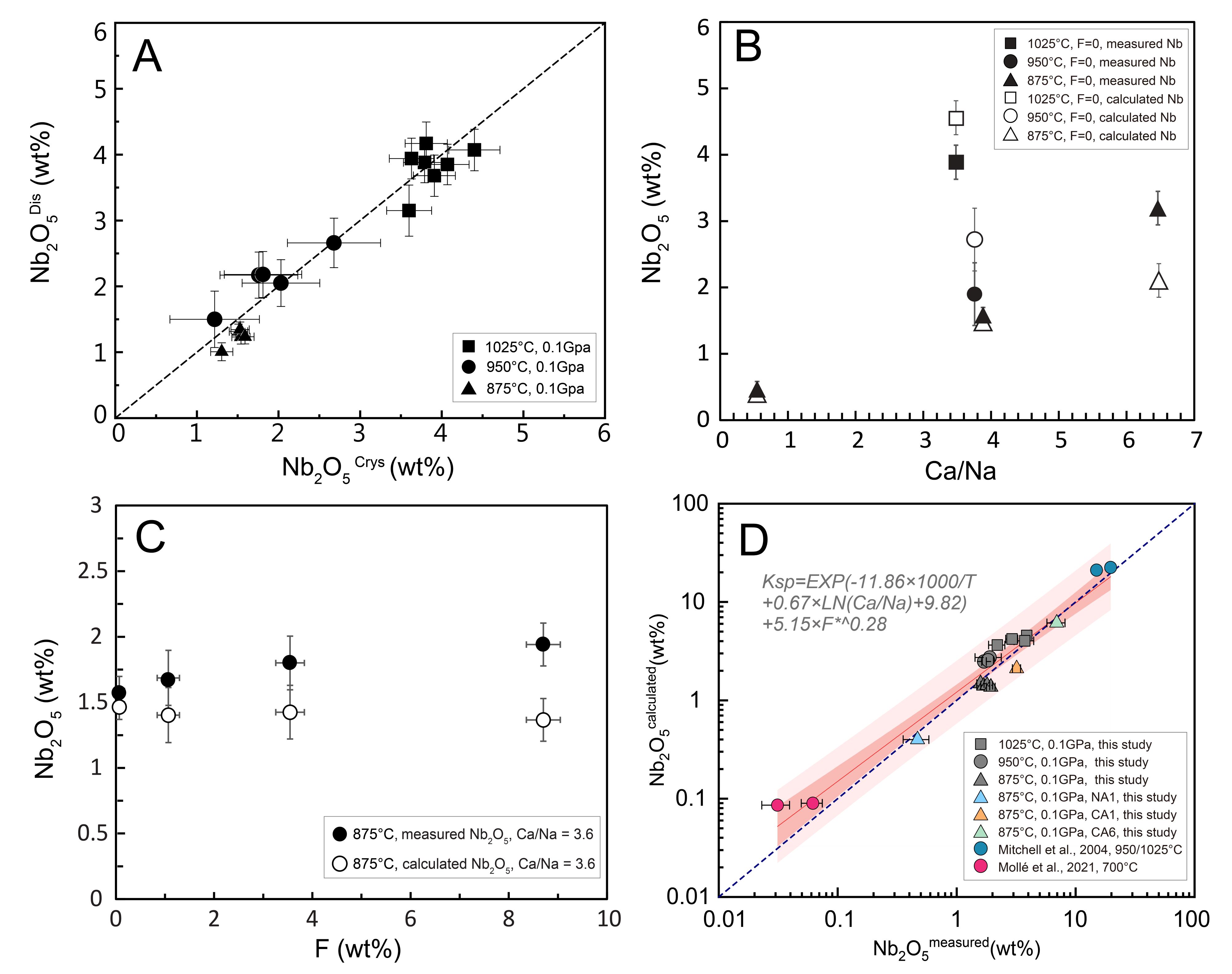 碳酸岩浆是深部碳循环的关键载体,其化学组成与构成地球绝大部分岩浆活动的硅酸岩浆截然不同。这种极其特殊的成分不仅激发了科学家的探索热情,更富集了铌等“关键金属”元素——这些元素因在高科技产业和战略工业中的核心应用而备受瞩目。然而,铌的超常富集究竟源于碳酸岩浆分异还是热液作用,学界长期争论不休。作为一种稀有金属资源,铌通常赋存于烧绿石 ((Na,Ca)2Nb2O6(F,OH))中,这也是经济型碳酸岩矿床中最主要的铌矿物。本研究通过实验,在精确控制温压条件下系统限定了合成碳酸岩熔体中铌的溶解度与结晶行为(图1),首次揭示了碳酸岩体系中烧绿石巨量结晶成矿的岩浆分异驱动机制,提出了碳酸岩系统化岩浆—热液铌成矿模式。